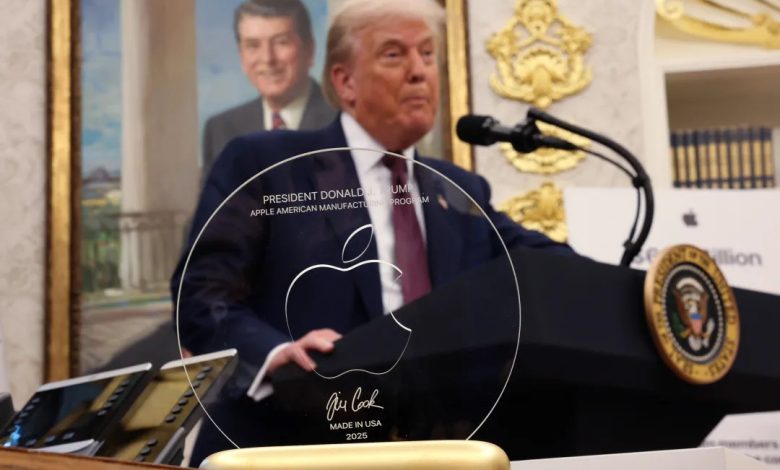 وفقًا لموقع The Verge، خلال مؤتمر صحفي عُقد في البيت الأبيض لمناقشة خطط آبل الجديدة للتصنيع في الولايات المتحدة، قدّم الرئيس التنفيذي تيم كوك هديةً للرئيس دونالد ترامب. هي قطعة زجاج “فريدة” من شركة Corning، المُصنّعة لزجاج هواتف آيفون، مُطعّمة بقاعدة من الذهب عيار 24 قيراطًا.