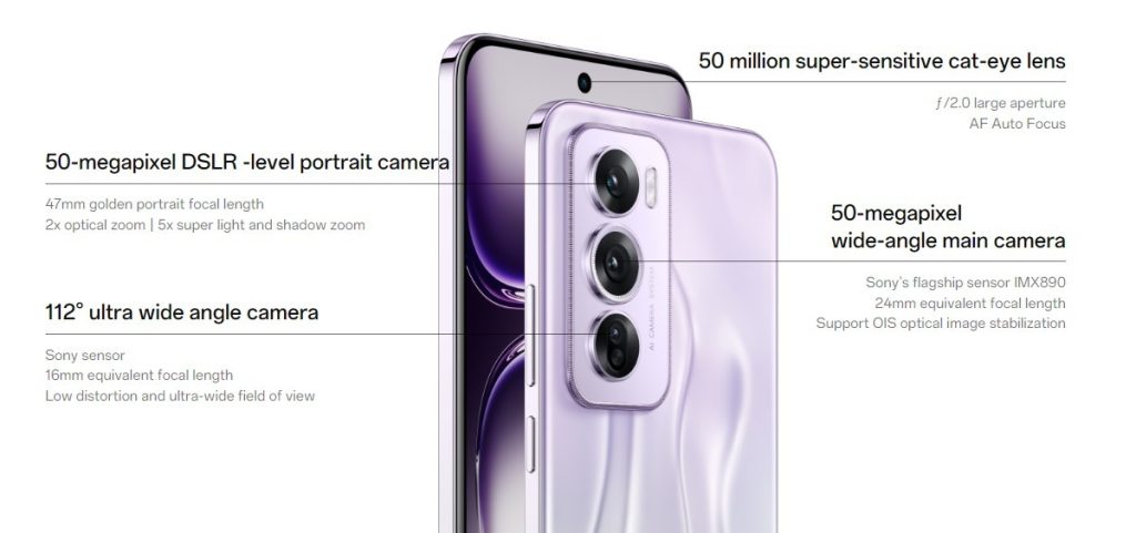 في حين يأتي Reno12 Pro بألوان “الفضي الأرجواني، والذهبي، والأسود” – Silver Fantasy Purple، وChampagne Gold، وEbony Black.