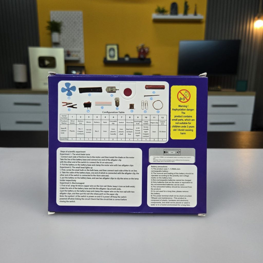 هذه المجموعة التعليمية المميزة تحتوي على كل ما تحتاج إليه للقيام بتجارب علمية ممتعة وآمنة. تشمل المجموعة محركًا كهربائيًا، مروحة، بطارية، مصباحًا، أسلاك توصيل، مشابك، ومكونات أخرى تفاعلية تسمح للأطفال باختبار وتعلم كيفية عمل الكهرباء بطريقة عملية وشيقة.