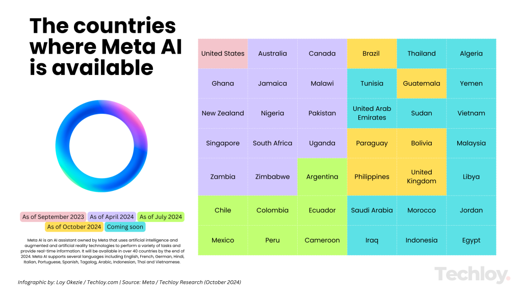 بعد هذا الطرح التدريجي، سيكون Meta AI متاحًا في 43 دولة حول العالم، مع دعم متعدد للغات. ما يتيح وصوله إلى مئات الملايين الأشخاص من مستخدمي تطبيقات ميتا المختلفة. بما في ذلك فيسبوك وانستجرام وواتساب وماسنجر.