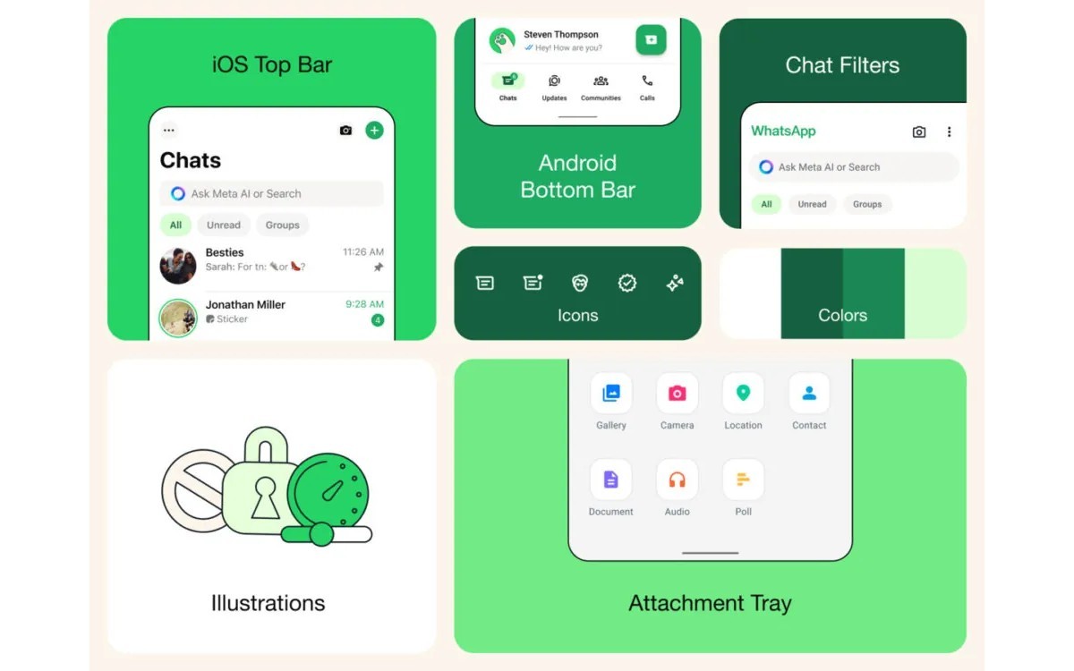تم نقل تبويبات المحادثات والحالة والمكالمات من الشريط العلوي إلى أسفل الواجهة. واختفت الواجهة الخضراء التي تحمل اسم واتساب في الأعلى، وأصبحت فقط باللون الأبيض مع اسم واتساب باللون الأخضر الجديدة. كذلك ظهر في الأعلى شريط بحث مدعوم بالذكاء الاصطناعي من ميتا.