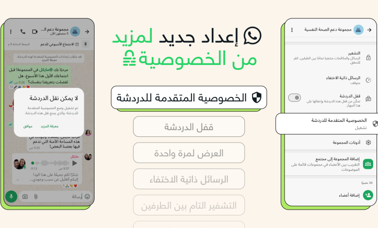 تقول واتساب: نقدم اليوم أحدث مستوى للخصوصية، وهو “الخصوصية المتقدمة للدردشة”. يساعد هذا الإعداد الجديد المتوفر لكل من الدردشات والمجموعات على منع الآخرين من مشاركة المحتوى خارج واتساب عندما ترغب في إضفاء المزيد من الخصوصية على محادثاتك.